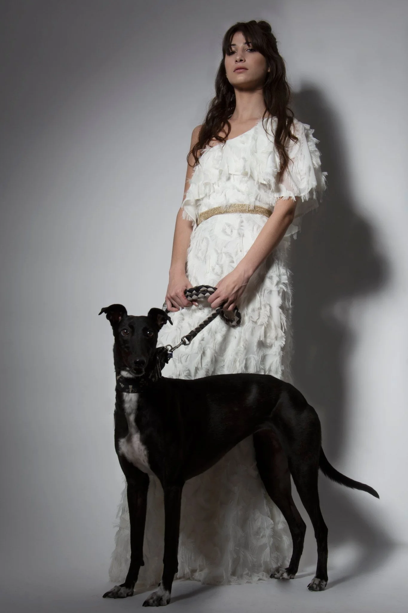 Joven mujer con vestido blanco y un perro grande negro con vetas blancas en un fondo gris.
