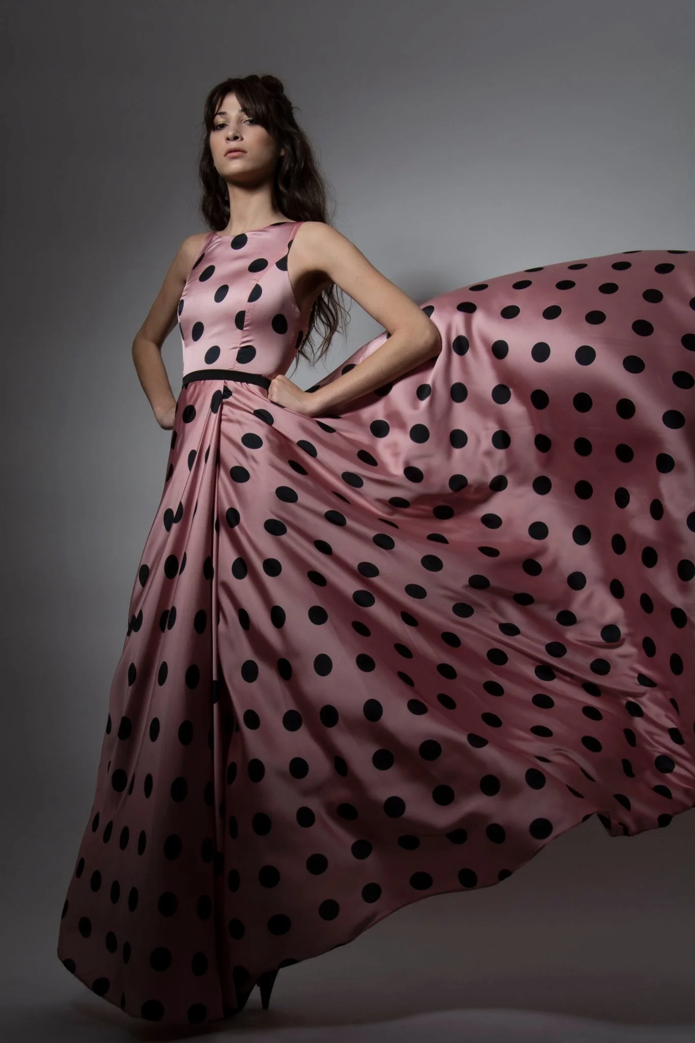 Mujer con vestido de seda rosa con lunares negros, de pie frente a fondo gris, usando tacones negros.