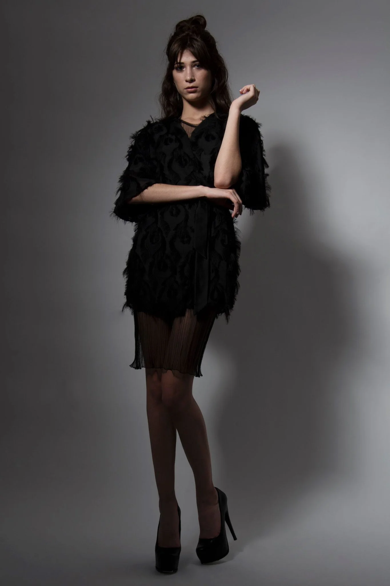Mujer con vestido largo y de textura de plumas en un fondo gris
