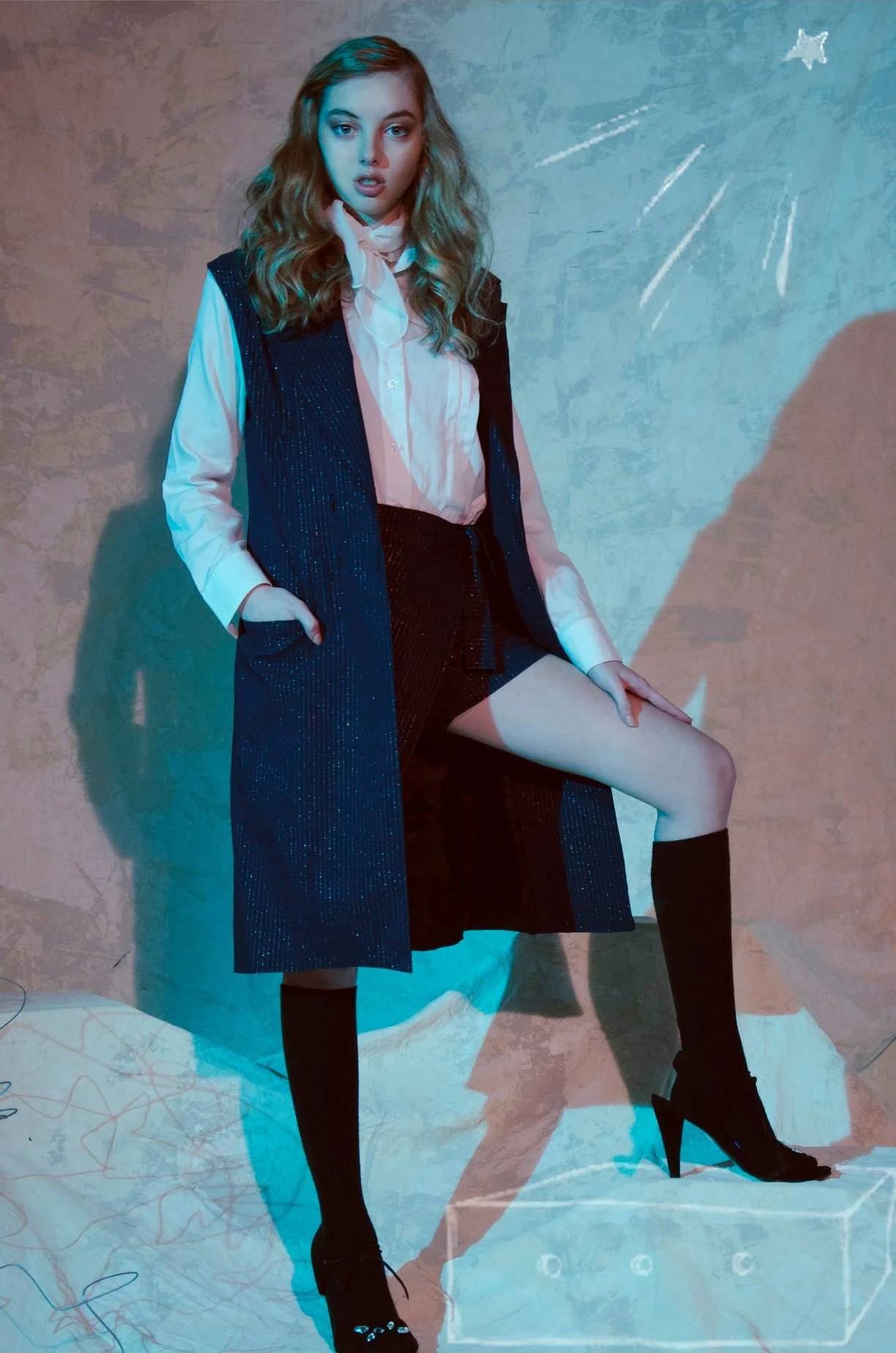 Mujer joven con blusa blanca, chaleco azul oscuro y falda corta negra, pose con una pierna levantada, usa medias negras y tacones. Fondo con dibujos de estrellas y líneas blancas.