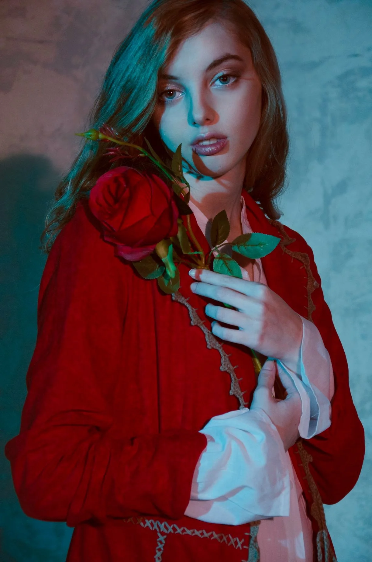 Mujer con cabello largo y liso, vestida con abrigo rojo y blusa blanca, sostiene una rosa roja frente a su pecho, con expresión seria y mirada directa.
