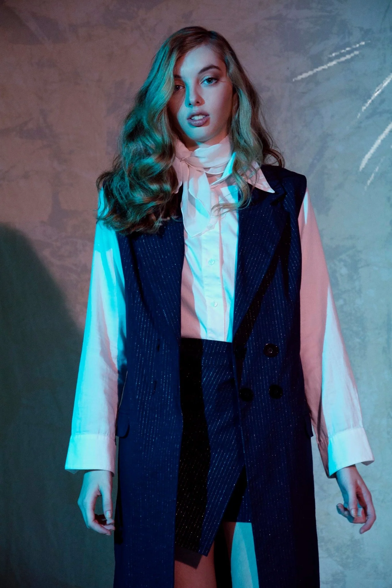 Mujer con cabello rizado y vestuario formal, con fondo neutro y efectos de iluminación azul y cálida.