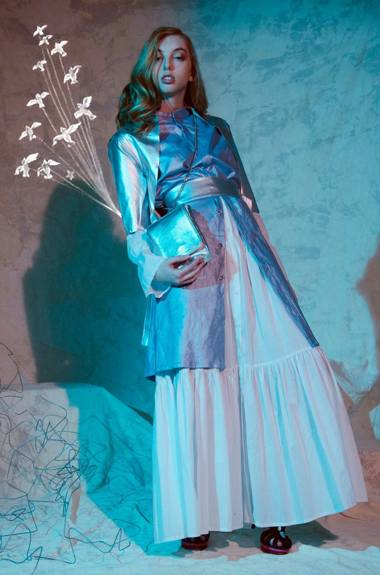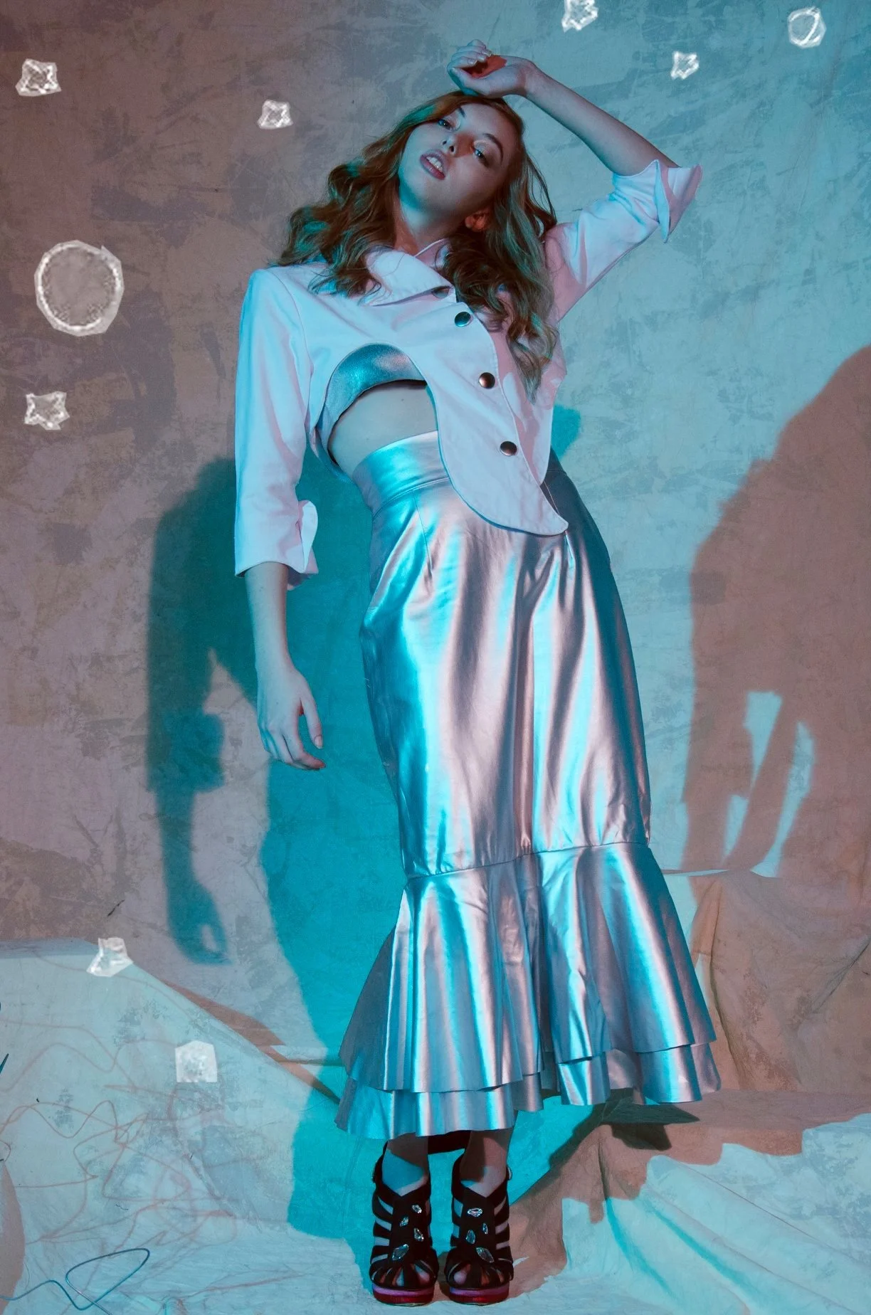 Una mujer con cabello rizado rubio claro usa un conjunto brillante plateado con una camisa rosada y una falda larga de seda plateada, en un fondo con efectos de luz y objetos flotantes.