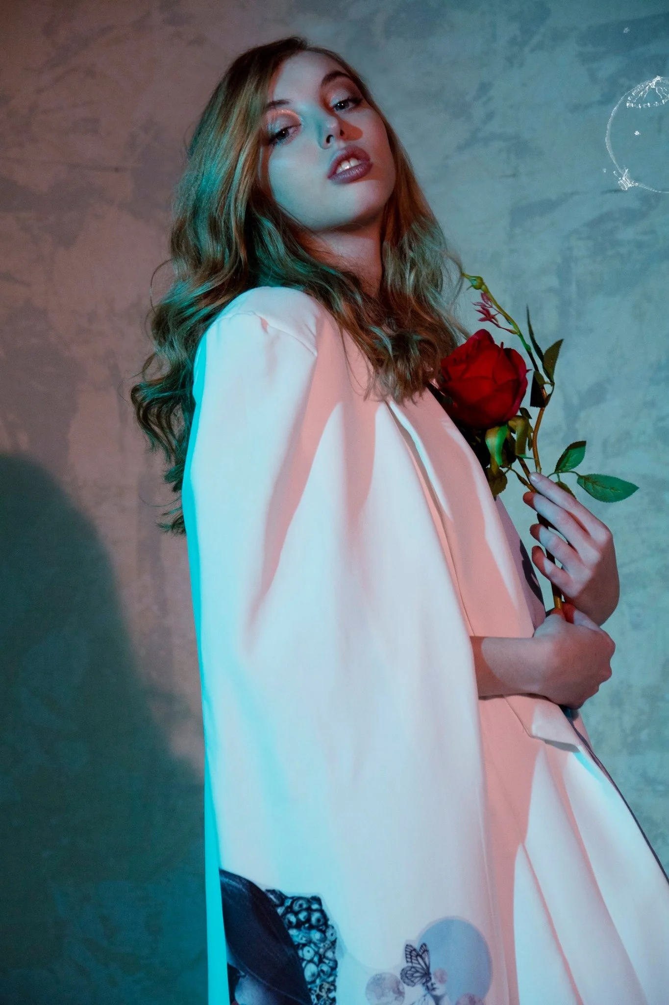 Joven mujer con cabello rizado, vestido rosa claro y maquillaje oscuro, sosteniendo una rosa roja en la mano, con fondo de pared de piedra y luces de colores.