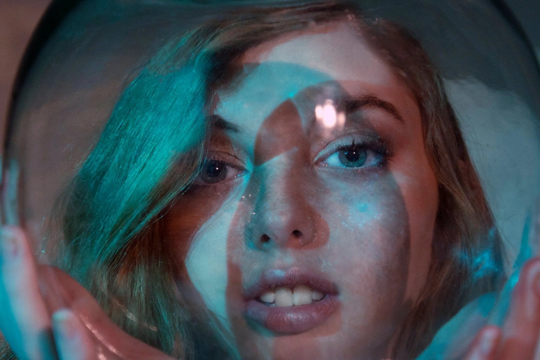 Recreación de ciencia ficción con mujer mirando a una superficie reflectante, con efectos de luz y color azul y verde.
