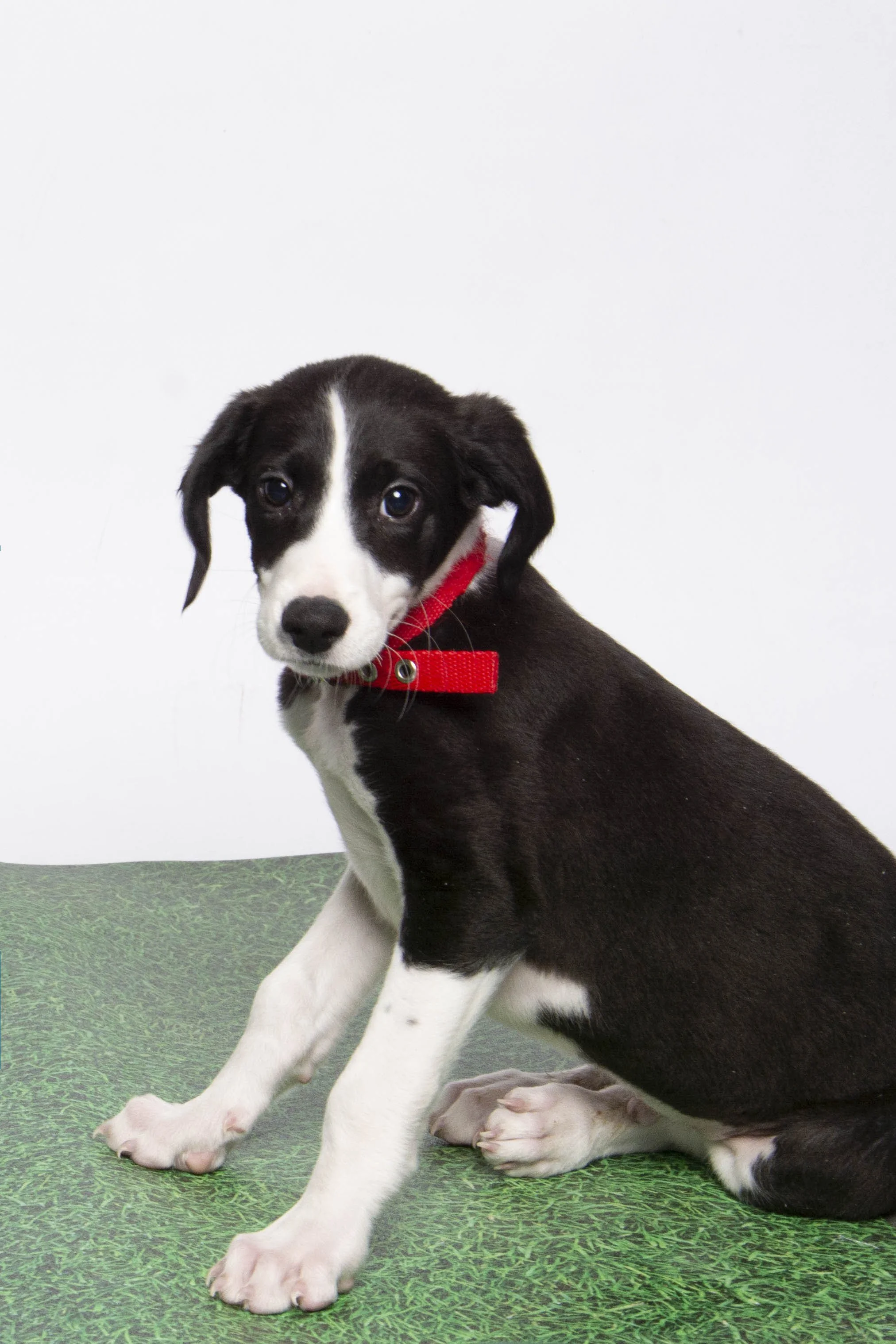 Cachorro joven de raza indistinta con collar rojo sentado sobre una alfombra verde y fondo blanco.