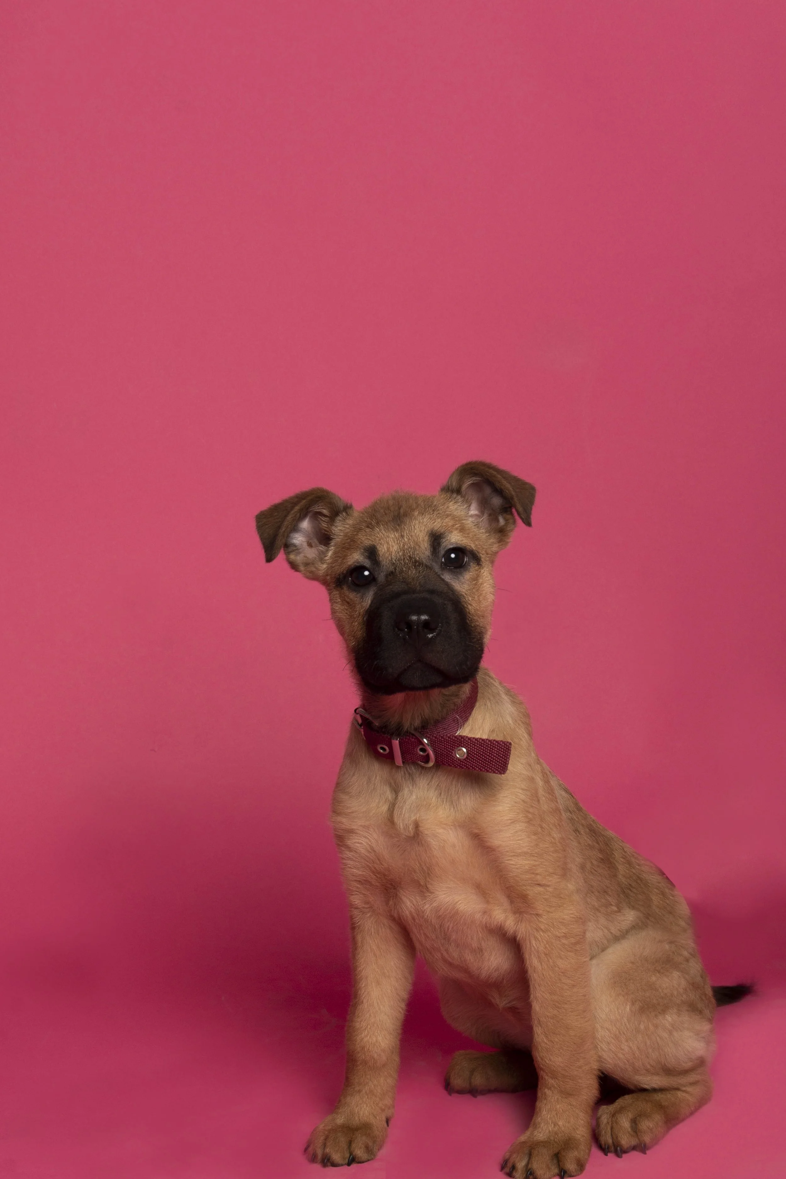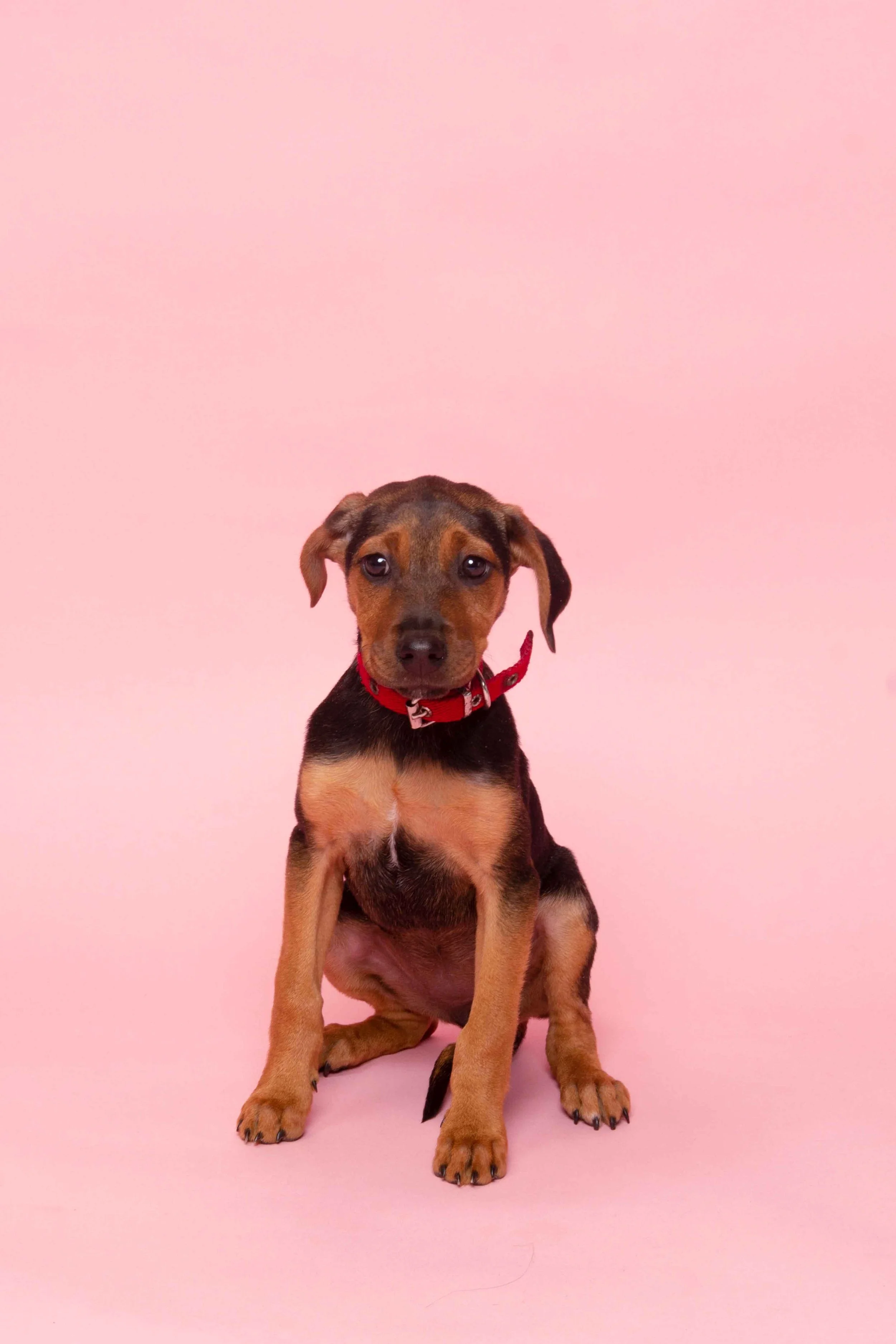 Un cachorro marrón y negro con collar rojo sentado en un fondo rosa