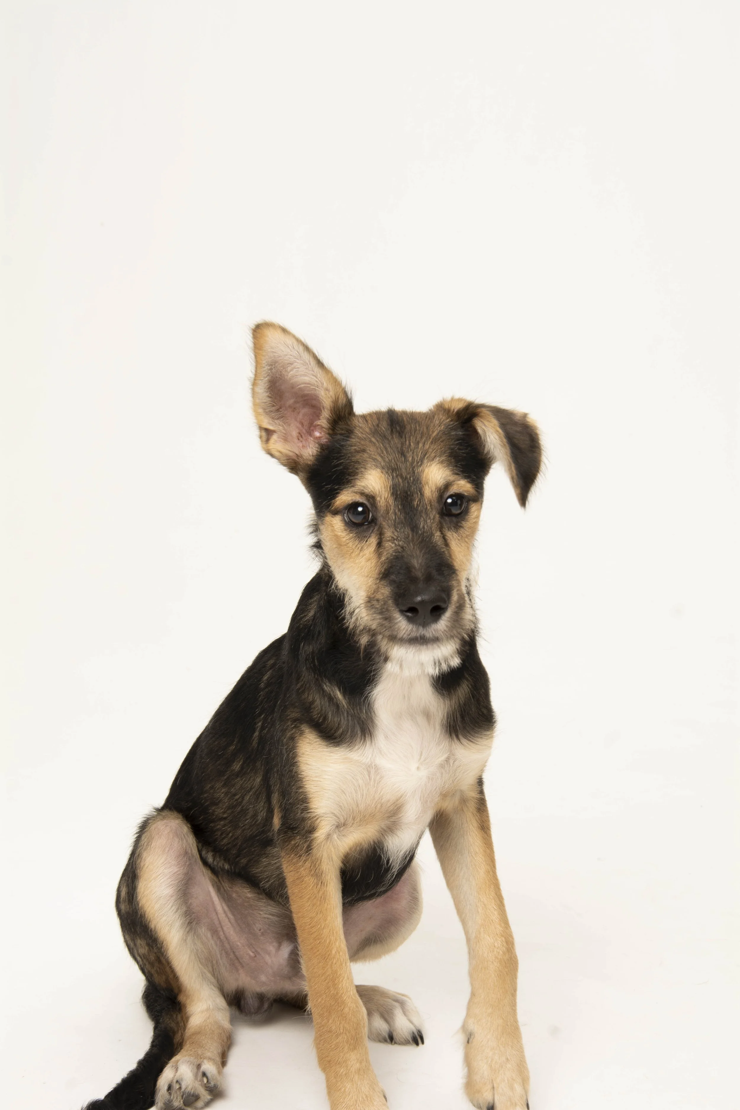 Perro joven de pelaje corto y mezcla de colores negro, marrón y blanco, sentado frente a fondo blanco.