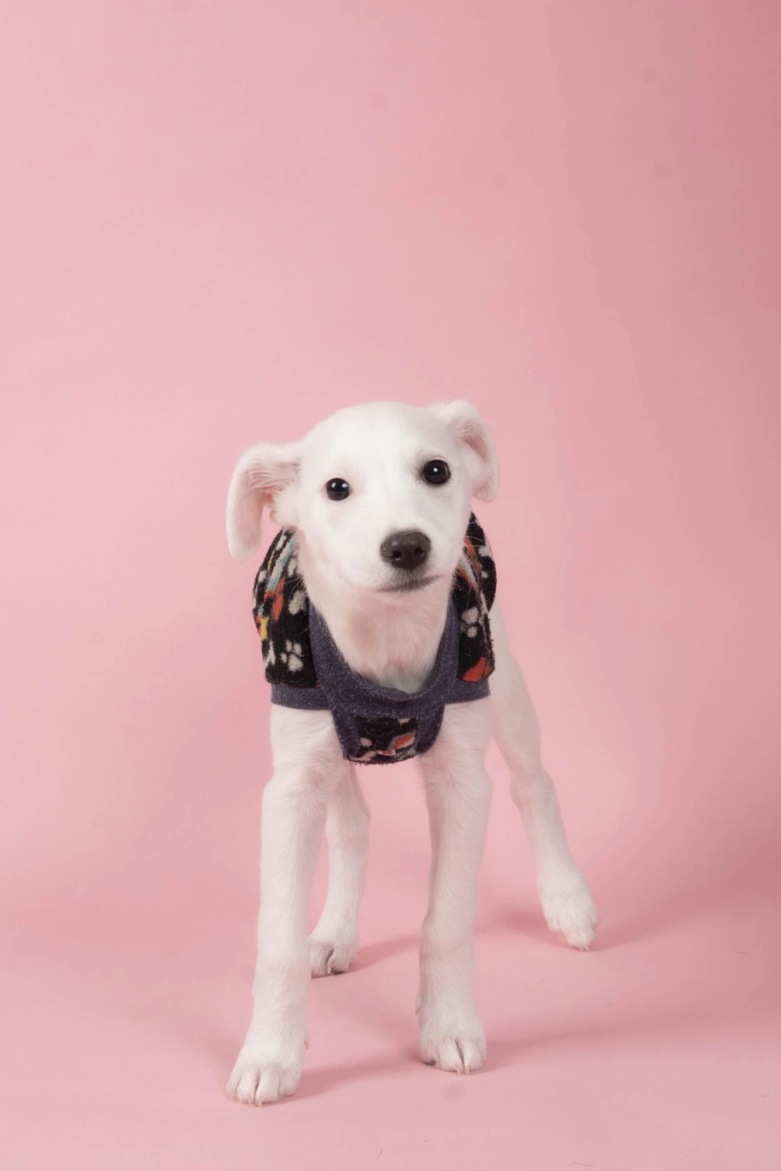 Un cachorro blanco de patas cortas y orejas caídas usando un suéter oscuro con patrones coloridos, parado sobre un fondo rosa.