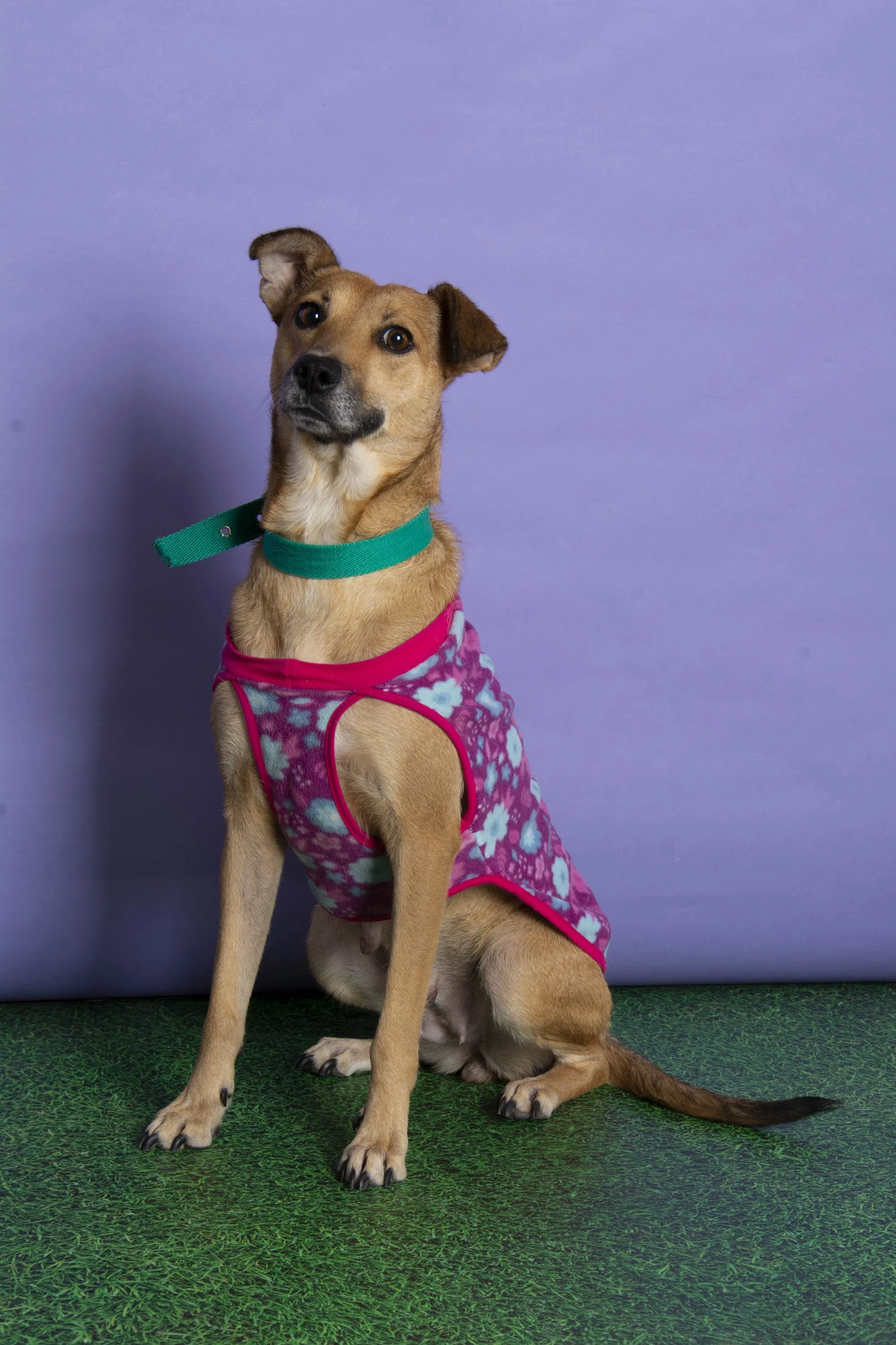 Perro de color marrón con una pata levantada, usando un chaleco color rosa con diseño de flores y un collar verde, sentado sobre césped artificial con fondo lila.